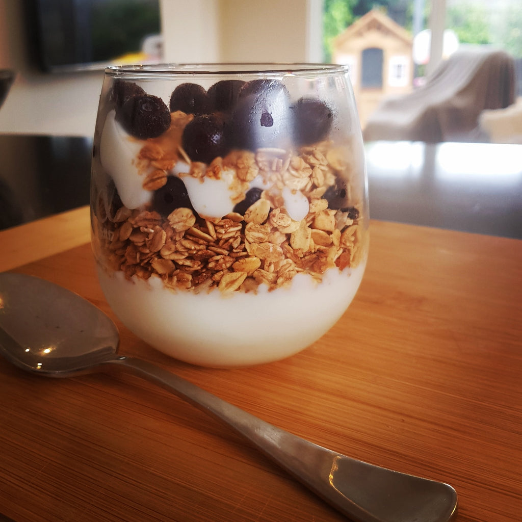 - Layer 1/2 to 2/3 of the yoghurt, then the muesli or granola and then the blueberries.